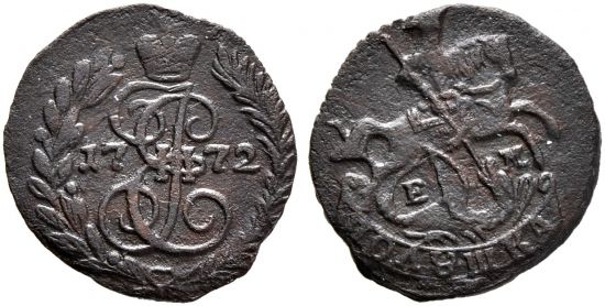 | − | This specimen was lot 100 in Sincona sale 65 ( | + | This specimen was lot 100 in Sincona sale 65 (Zürich, October 2020), where it did not sell. The catalog description<sup>[1]</sup> noted, <blockquote>"Polushka 1772, Ekaterinburg Mint, EM. Rare date. Very fine. (''Полушка 1772, Екатеринбургский МД, ЕМ. 2,21 г. Биткин 752. Редкая дата. Состояние очень хорошее.'')"</blockquote> This type was struck at Ekaterinburg 1766-76, 1786-90 and 1794-96. This type was also struck at Suzun (KM) and Anninskoye (no mintmark) but those issues are much scarcer. The 1772 is not listed as rare in the SCWC. |