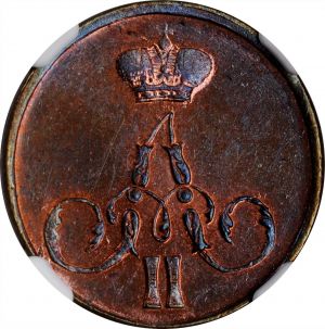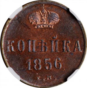 This specimen was lot 73442 in Stack's Bowers Collector's Choice sale (Santa Ana, CA, June 2020), where it sold for $144. The catalog description[1] noted, "RUSSIA. Kopek, 1856-EM. Ekaterinburg Mint. Alexander II. NGC MS-63 Brown. This choice, deep brown example presents intense vibrancy and brilliance, with a color that verges upon violet." This type was struck at Ekaterinburg and Warsaw (KM Y3.2) 1855-60. The Warsaw issues are considerably scarcer than the Ekaterinburg product. The Ekaterinburg mint closed in 1876. The specification given here is from Numista; the 4 g standard in the SCWC is wrong.
