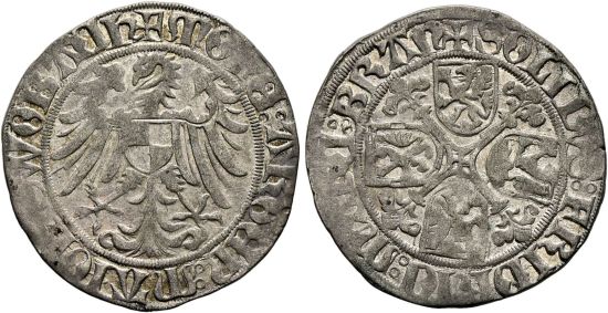 − | This specimen was lot 572 in Sincona sale 89 ( | + | This specimen was lot 572 in Sincona sale 89 (Zürich, May 2024), where it sold for 120 CHF (about US$159 including buyer's fees). The catalog description<sup>[1]</sup> noted, <blockquote>"''DEUTSCHLAND Brandenburg-Franken, Markgrafschaft, Friedrich, 1495-1515. Schilling o. J., Schwabach. Vorzüglich. Überdurchschnittliche Erhaltung. Exemplar der Auktion Bankhaus Aufhäuser 10, München, Oktober 1993, Los 1675.'' ([[Germany]], [[German States, Brandenburg|margraviate of Brandenburg-Franconia]], Frederick, 1495-1515, undated schilling, Schwabach mint. Extremely fine, Extraordinary condition.)"</blockquote> A dated version of this coin is known for 1511-15. Brandenburg-Franconia was divided into Brandenburg-Ansbach and Brandenburg-Bayreuth on the death of Georg Friedrich in 1603. |