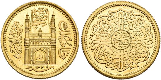 − | This specimen was lot 2527 in Sincona sale 77 ( | + | This specimen was lot 2527 in Sincona sale 77 (Zürich, May 2022), where it sold for 4,500 CHF (about US$5,642 including buyer's fees). The catalog description<sup>[1]</sup> noted, <blockquote>"''INDIA | Princely States | [[India, Hyderabad|Hyderabad]], Mir Mahbub Ali Khan, 1285-1329 H. (1869-1911). 1/2 Ashrafi 1325 H.Year 41, Haidarabad. Initial Mîm in doorway of charminar. NGC MS67. Prachtexemplar.'' (Cabinet piece.)"</blockquote> This type was struck AH 1325 and 1326, both with regnal year 41. It is rare. The regnal date is on the reverse, about 8 o'clock. |