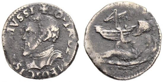 − | The first specimen was lot 1642 in Sincona sale 59 ( | + | The first specimen was lot 1642 in Sincona sale 59 (Zürich, October 2019), where it sold for 500 CHF (about US$606 including buyer's fees). The catalog description<sup>[1]</sup> noted, <blockquote>"''ITALY | Musso, Gian Giacomo de Medici, 1528-1530. Quattrino o. J. Mosso. IO IA DE MEDICIS M MVSSI, Büste nach links. Rv. Liegender Lario, dahinter Schiff. Äusserst selten. Sehr schön. Überdurchschnittliche Erhaltung.'' ([[Italy]], lordship of Musso, Gian Giacomo de Medici, 1528-30, undated quattrino, Mosso mint. Obverse: bust left; reverse: Lario lies, ship behind. Extremely rare, Very fine, Extraordinary condition.)"</blockquote> The second specimen was lot 1643 in Sincona sale 59 (Zürich, October 2019), where it sold for 850 CHF (about US$1,030 including buyer's fees). The catalog description<sup>[1]</sup> noted, <blockquote>"''ITALY | Musso, Gian Giacomo de Medici, 1528-1530. Quattrino o. J. Mosso. IO IA DE MEDICIS Büste nach links. Rv. MAR MVSSI COM LEVCI Lilienkreuz. Sehr selten. Sehr schön.'' ([[Italy]], lordship of Musso, Gian Giacomo de Medici, 1528-30, undated quattrino, Mosso mint. Obverse: bust left; reverse: floriate cross. Very rare, Very fine.)"</blockquote> The county of Musso, on the east bank of Lago Como, lies in the duchy of [[Italy, Milan|Milan]]. The count Gian Giacomo, brother of pope Pius IV, set himself up there as a robber baron in the 1520's before being defeated and deposed by his neighbors. He managed to issue a few coins during his ascendancy, including some gold. All are rare today. This quattrino was four denari. |