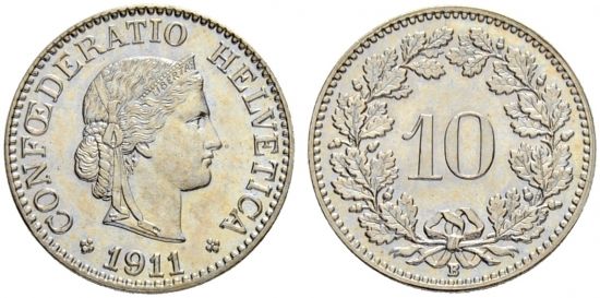 − | This specimen was lot 3892 in Sincona sale 64 ( | + | This specimen was lot 3892 in Sincona sale 64 (Zürich, June 2020), where it sold for 50 CHF (about US$63 including buyer's fees). The catalog description<sup>[1]</sup> noted, <blockquote>"''SWITZERLAND | Confederation | misc, 10 Rappen 1911 B, Bern. FDC. Prachtvolle Erhaltung.'' (Swiss confederation, ten rappen of 1911, Bern mint. Uncirculated, Magnificent condition.)"</blockquote> This type was struck 1879-2015 without change. This date is common. Prior to confederation in 1850, each Swiss canton issued its own coins. |
