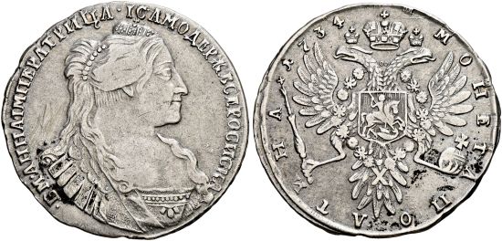 This specimen was lot 180 in Sincona sale 78 (Zürich, October 2022), where it sold for 350 CHF (about US$420 including buyer's fees). The catalog description[1] noted, "RUSSIA | Russian Empire and Federation | Anna, 1730-1740, Poltina 1734, Kadashevsky Mint. 2 roubles according to Petrov. About very fine. Mount mark and scratches." This type was struck 1734-37 without mintmark for the empress Anna. Mintages are not known but must have been small as the type is rare today.