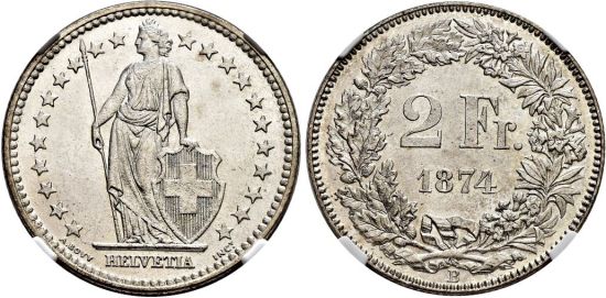 − | This specimen was lot 5233 in Sincona sale 83 ( | + | This specimen was lot 5233 in Sincona sale 83 (Zürich, May 2023), where it sold for 800 CHF (about US$1,057 including buyer's fees). The catalog description<sup>[1]</sup> noted, "[[Switzerland|SWITZERLAND]], 2 Franken 1874 B, Bern. ''Selten in dieser Erhaltung'' (Rare in this condition). NGC MS64." This type was struck at the Bern mint starting in 1874 and the design is still in use today tho the coin is now nickel. This specimen is struck to the standard of the French two francs of 1866-1920. Many of the dates from the twentieth century are very common but this one is expensive in nice condition. Prior to confederation in 1850, each Swiss canton issued its own coins. |
