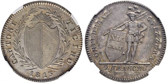 | − | This specimen was lot 3614 in Sincona sale 64 ( | + | This specimen was lot 3614 in Sincona sale 64 (Zürich, June 2020), where it sold for 5,750 CHF (about US$7,205 including buyer's fees). The catalog description<sup>[1]</sup> noted, <blockquote>"''SWITZERLAND | Tessin/Ticino | misc. 2 Franken 1813, Bern. Variante ohne Mzz. Stern. Sehr selten in dieser Erhaltung. NGC MS65. Prachtvolle Erhaltung mit herrlicher Patina.'' (canton of [[Switzerland, Ticino|Ticino]], two francs of 1813, Bern mint, variety without star privy mark. Very rare in this condition, Beautiful condition with magnificent patina.)"</blockquote> In this Italian-speaking canton, 12 denari = 1 soldo, 20 soldi = 1 franco. |