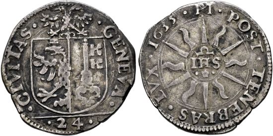 | − | This specimen was lot 3265 in Sincona sale 91 ( | + | This specimen was lot 3265 in Sincona sale 91 (Zürich, May 2024), where it sold for 160 CHF (about US$215 including buyer's fees). The catalog description<sup>[1]</sup> noted, <blockquote>"''SCHWEIZ Genf/Genève, Stadt und Kanton, 24 Sols (2 Gulden) 1635, Genf. Mzz. PM (ligiert). Fast sehr schön. Randfehler.'' ([[Switzerland]], [[Switzerland, Geneva|canton of Geneva]], 24 sols or two gulden of 1635, Geneva mint, mintmark ligated "PM". About very fine, Edge flaw.)"</blockquote> This type was struck 1634-36. |