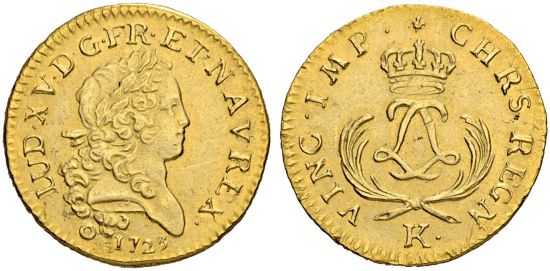 − | This specimen was lot 355 in Sincona sale 54 ( | + | This specimen was lot 355 in Sincona sale 54 (Zürich, May 2019), where it sold for 1,200 CHF (about US$1,428 including buyer's fees). The catalog description<sup>[2]</sup> noted, <blockquote>"''Frankreich, konigreich, Louis XV. 1715-1774. Louis dor mirliton 1723 K, Bordeaux. Vorzüglich. Kleiner Schrötlingsfehler.'' (kingdom of [[France]], Louis XV, 1715-74, gold louis Mirliton of 1723, Bordeaux mint. Extremely fine, Minor flan defect.)"</blockquote> The specimen shown is a ''louis d'or Mirliton, palmes courtes,'' struck at the Bordeaux mint (mintmark "K") during the minority of king Louis XV. This type was struck 1723 only but from twenty-seven mints. It would be extremely rare but for a quantity recovered in 1965 from the wreck of ''Le Chameau'', a French troopship discovered off the coast of Nova Scotia. This type was superseded by the ''louis d'or Mirliton, palmes longues,'' struck 1723-25. That coin in turn was superseded by the ''louis d'or aux lunettes,'' struck 1726-40. |