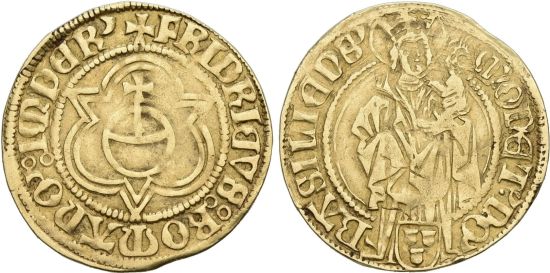 "SCHWEIZ Reichsmünzstätte Basel Friedrich, als Kaiser, 1452-1493, Goldgulden o. J. (1478-90), Basel. Rv. Madonna mit Kind von vorne, unten das Wappen von Philipp von Weinsberg. Sehr schön. Kleine Schrötlingsfehler. (Switzerland, canton of Basel, imperial mint of Frederick III, 1452-93, undated goldgulden, circa 1478-90, Basel mint. Obverse: Madonna and Child facing, the arms of Philip of Weinsberg at their feet. Very Fine, Minor flan flaws.)"