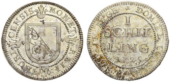 − | The first specimen was lot 3596 in Sincona sale 20 ( | + | The first specimen was lot 3596 in Sincona sale 20 (Zürich, October 2014), where it sold for CHF 250 (about US$313 including buyer's fees). The catalog description<sup>[1]</sup> noted, "Schilling 1725. FDC. (uncirculated.)" The second specimen was lot 3098 in Sincona sale 47 (Zürich, May 2018), where it sold for 325 CHF (about US$390 including buyer's fees). The catalog description<sup>[2]</sup> noted, <blockquote>"''SWITZERLAND, Stadt und Kanton Zürich, Schilling 1725. Sehr selten in dieser Erhaltung. FDC.'' (canton of Zürich, schilling of 1725. Very rare in this condition, Uncirculated.)"</blockquote> This is the introductory date of a type struck 1725, 1730, 1736, 1739-51, 1754. Like many Swiss minors, it has a low catalog value. One [[Zurich 1723 thaler Dav-1784|thaler]] = 80 schillinge. |