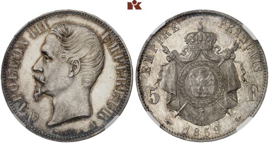 "FRANKREICH, KAISERTUM, Napoléon III, 1852-1870. 5 Francs 1859, A, Paris. In US-Plastikholder der NGC mit der Bewertung MS 63 (5784001-002). Von größter Seltenheit in dieser Erhaltung. Prachtexemplar. Herrliche Patina, fast Stempelglanz. Exemplar der Auktion Jean Vinchon Numismatique, Monte-Carlo April 1976, Nr. 420. Die 5 Francs-Stücke von 1859 wurden in nur geringer Stückzahl ausgegeben und gelangten direkt in den Zahlungsverkehr. Dadurch sind heute nur sehr wenige Stücke in guter Erhaltung bekannt. In fast Stempelglanz wie dieses Exemplar ist dieser Münztyp extrem selten anzutreffen. (empire of France, Napoleon III, 1852-70, five francs of 1859, Paris mint. Graded NGC MS63. Extremely rare in this quality, choice example, superb patina, about uncirculated. The 5 franc pieces from 1859 were only issued in small numbers and went directly into circulation. As a result, very few pieces in good condition are known today. This coin type is extremely rare to find in this quality.)"