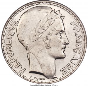 Specification: 20 g, 0.680 fine silver, 35 mm diameter, reeded edge, designed by Pierre Turin (1891-1968).