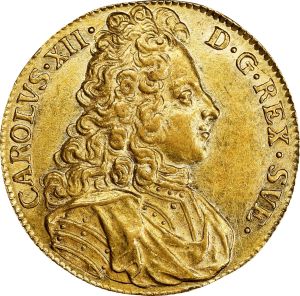 "Nearly Mint 1702 Double Ducat with Commendable Details, The First Swedish Double Ducat, SWEDEN. 2 Ducats, 1702. Stockholm Mint. Karl XII. NGC AU-58. Mintmaster: Henrik Zedritz (HZ). Engraver: Arvid Karlsteen. A technically brilliant Double Ducat, one cannot understate the appeal of this example, as it falls just short of a lofty Mint State grade on account of light wear on the cheek. The finely imparted details are impressive, with a particular clarity that is often missing on gold of this period. Only light brushes of friction, wholly consistent for the grade, are seen in the fields that are largely free of the usual peppering of marks. This coin is a milestone in Swedish numismatics as it is the first double Ducat struck in Sweden. Ex: Countship of Brahesminde Collection (Private Sale - 1922)."