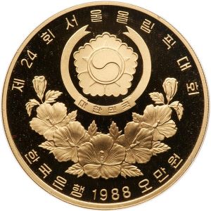 This specimen was lot 1901 in Goldberg Sale 139 (Los Angeles, June 2024), where it sold for $2,340. The catalog description[1] noted, "Korea (South). 50,000 Won, 1988. For the 1988 Olympic games. Pul Guk Temple. With Certificate. Choice Brilliant Proof." The reverse features the pagoda at Pul Guk temple (now spelled Bulguksa) in Gyeongju city, designated a national treasure. This is not the first time this building was featured on a Korean coin.
