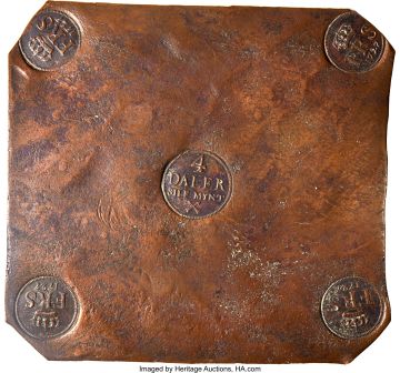 This specimen was lot 33240 in Heritage sale 3089 (Dallas, TX, January 2021), where it sold for $5,400. The catalog description[1] noted, "Frederick I Plate Money 4 Daler 1727 XF, Avesta mint. An even and well-finished plate, perhaps lightly cleaned long ago, though this is hardly unknown for this series often recovered from shipwrecks. We have been able to locate very few examples of this date coming to auction in recent years. From the Charles J. Opitz Collection." This type was struck in Sweden 1720-46 and is the most common of its denomination.