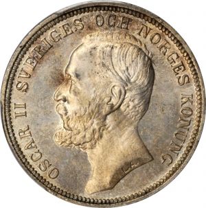 This specimen was lot 21738 in Stack's Bowers ANA sale (Chicago, August 2019), where it sold for $1,260. The catalog description[1] noted, "SWEDEN. 2 Kronor, 1892-EB. Stockholm Mint. Oscar II. PCGS MS-64 Gold Shield. A lightly toned near gem, this better date features a charming golden tone throughout and dazzling, problem-free surfaces. A premium quality piece for the grade assigned." Collecting Swedish coins is complicated by the multiple currency reforms the country underwent during the period. In 1873, the riksdaler species was dropped and 100 öre = one krona (the krona, at 7.5 g, 0.800 fine silver, was slightly smaller than the old riksdaler riksmynt). The type is noted for 1890-1904. This date is common in worn condition but scarce nice. The system adopted in 1873 is still in use today, the Swedes having recently declined to adopt the euro.