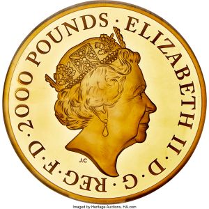 This specimen was lot 31250 in Heritage sale 3089 (Dallas, TX, January 2021), where it sold for $360,000. The catalog description[1] noted, "Great Britain. Elizabeth II gold Proof "Una and the Lion" 2000 Pounds (2 Kilos) 2019 PR69 Ultra Cameo NGC. An absolutely massive modern British rarity, and the second largest denomination ever struck by the Royal Mint. Produced to a miniscule figure of just 4 pieces, of which this is verified to be the first, the type was issued in commemoration of the 170th anniversary of William Wyon's acclaimed 1839 Una and the Lion 5 Pounds, part of Victoria's delayed coronation Proof set and often considered to be one of the finest designs ever engraved for a British coin. Essentially flawless in technical quality, exceptional even as a collector's issue owing to its vastly expansive surfaces, perhaps only the most minor evidence of haze on the obverse accounts for its sub-70 designation. Currently the only of the four known pieces to be certified, we can only anticipate the great heights to which this monumental coin will soar, not least owing to the rising interest among collectors for the low-mintage emissions of the Royal Mint from the last several years. Sold with its original wooden case of issue, together with a fine pair of gloves for handling the coin, and the COA numbered 01."