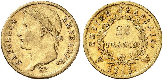 "I. Kaiserreich. Napoleon I. 1804-1815. 20 Francs 1814 W, Lille. Selten. Vorzüglich. Überdurchschnittliche Erhaltung. (First empire of France, Napoleon I, 1804-15, twenty francs of 1814, Lille mint. Rare, Extremely fine, Extraordinary condition.)"