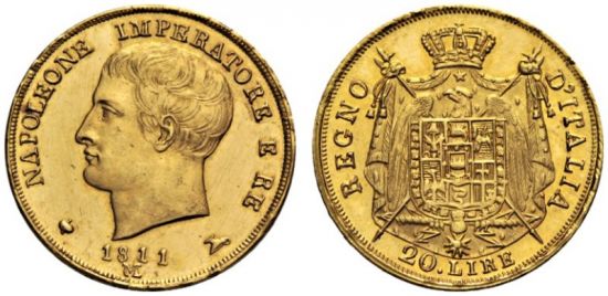 − | This specimen was lot 2032 in Sincona sale 25 ( | + | This specimen was lot 2032 in Sincona sale 25 (Zürich, October 2015), where it sold for 12,000 CHF (about US$14,823 including buyer's fees). The catalog description<sup>[1]</sup> noted, <blockquote>"Napoleone I. 1805-1814 20 Lire 1811. Milan Head of the Emperor to l., date and Mmk. M for Milan below. Rev. Arms on crowned mantle. Value below. Of highest rarity in this quality. Proof. Brilliant uncirculated (NGC PF61 Cameo). Cabinet piece."</blockquote> This coin was struck in Milan for Napoleon's kingdom of Italy which lasted 1804-1814. The twenty lire piece matched the French twenty francs and was struck in limited numbers 1808-14. Its larger sister, the forty lire piece, is much more often encountered. The silver five lire was struck in Milan, Venice and Bologna. |