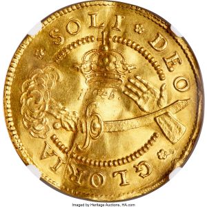 Friedberg also mentions a double portugaloser (20 ducats, Fr-122), a single portugaloser (10 ducats, Fr-123), six ducats (Fr-125), five ducats (Fr-124) and three ducats (Fr-127) for 1659. All are rare and Fr-122 is unique. This specimen was offered again as lot 1616 in Sincona sale 94 (Zürich, October 2024), where it sold for 24,000 CHF (about US$33,264 including buyer's fees).