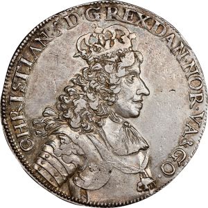 Specie dalers for 1670 include KM 97/Dav-3650, KM 98/Dav-3650A, KM 99/Dav-3651 and double specie dalers include KM 100/Dav-3649 (shown here), KM 101/Dav-3649A and KM 102. This one has a crowned bust of Christian V and the date to the upper left of the reverse; two are known to exist, per the SCWC.