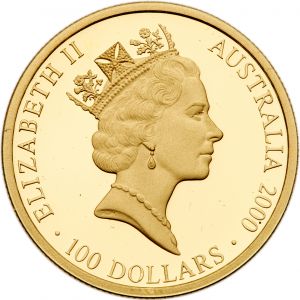 This specimen was lot 2231 in Goldberg sale 109 (Los Angeles, January 2019), where it sold for $492. The catalog description[1] noted, "Australia. 100 Dollars, 2000 (1998). Elizabeth II. Runner training in rain. Sydney 2000 Olympic games. In original case. Choice Brilliant Proof." This is part of a set of twelve issued for the Sydney Olympics. Altho this one was minted in 1998, we have listed it under 2000 as that is the date on the coin.
