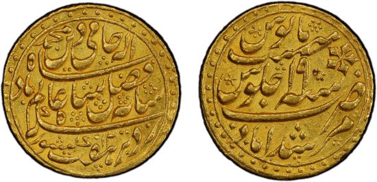 This specimen was lot 720 in Steve Album Auction 51 (Santa Rosa, CA, January 2025), where it sold for $2,640. The catalog description[1] noted, "BENGAL PRESIDENCY: AV mohur, Murshidabad, AH1200 (1785/86) year 19, East India Company issue in the name of Shah Alam II; struck mainly at Calcutta but also at Murshidabad without a distinguishing symbol; wonderful bold strike! NGC graded AU58." This type originally struck years 10-19, then the date was frozen at year 19 and struck for many years thereafter. While the Mughal Empire lasted, the British in Bengal were careful to strike coinage in the emperor's name. The inscriptions are in Arabic. The date should read "۱۹".