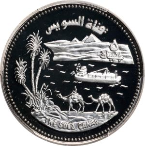 This specimen was lot 38116 in Stack's Bowers NYINC sale (New York, January 2025), where it sold for $780. The catalog description[1] noted, "EGYPT. 5 Pounds, AH 1415/1994. PCGS PROOF-69 Deep Cameo. Suez Canal." There seems to have been two series of commemorative five pounds struck in 1994; one with the country name "EGYPT" and the other with the country name "A.R.E." The first series was 17.5 g, the second 22.5 g silver. Many of the designs were also used on gold fifty pounds.
