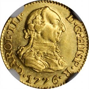 This specimen was lot 21714 in Stack's Bowers ANA sale (Chicago, August 2019), where it sold for $900. The catalog description[1] noted, "SPAIN. 1/2 Escudo, 1776-M PJ. Madrid Mint. Charles III. NGC MS-61. Madrid mint. Sharply struck with soft satin luster." This type was struck in Madrid 1772-85 (KM 415.1) and Seville 1773-83 (KM 415.2) and is not especially rare tho choice specimens are always in demand. Half escudos were struck in metropolitan Spain 1738-97 in considerable numbers and are quite a bit more common than their silver equals, the eight reales. This is opposite from Latin America, where silver pesos were minted in vast quantities but half escudos would not be minted until the reign of Ferdinand VII. Assayer PJ is listed for 1769-79.