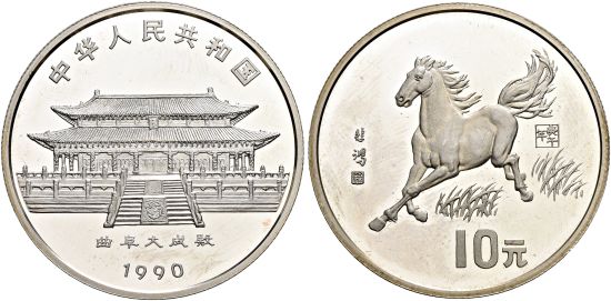 | − | This specimen was lot 2098 in Sincona sale 77 ( | + | This specimen was lot 2098 in Sincona sale 77 (Zürich, May 2022), where it sold for 80 CHF (about US$97 including buyer's fees). The catalog description<sup>[1]</sup> noted, <blockquote>"''CHINA | Volksrepublik. 10 Yuan 1990. Jahr des Pferdes. Polierte Platte. Im Originaletui mit Zertifikat.'' (people's republic of [[China]], ten yuan of 1990, Year of the horse, Choice Proof, In original box with certificate.)"</blockquote> This ten yuan was part of a series of NCLT's honoring the Year of the Horse which included, among others, a platinum 100 yuan ([[China 1990 100 yuan KM-287|KM 287]]). |