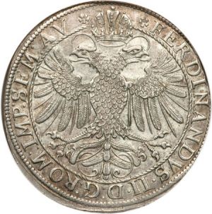 The second specimen was lot 26081 in Heritage sale 3032 (Chicago, April 2014), where it sold for $3,818.75. The catalog description[2] noted, "Chur. Canton Taler 1633, AU50 NGC. With title of the Holy Roman Emperor Ferdinand II. A few minor marks in the reverse fields, yet boldly struck with an overall exceptional appearance. The ibex is found within the towers of the city on the obverse, with the Habsburg double eagle on the reverse. One can go years without seeing this Taler type." Chur, among with the rest of Switzerland, left the Empire in 1648 as part of the Treaty of Westphalia which ended the Thirty Years War. The city arms feature a leaping ibex.
