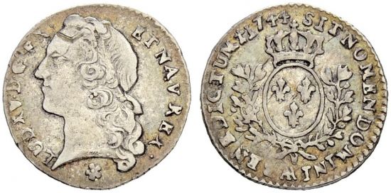 This diminutive coin, called a 1/20 écu "au bandeau", was the French equivalent of a half dime. In the coinage system of the ancien régime, the 1/20 écu = 6 sols. The type was struck 1740-69 but is recorded for the Metz mint ("AA") in 1740, 1744, 1748-49, 1760, 1765, 1769 only.