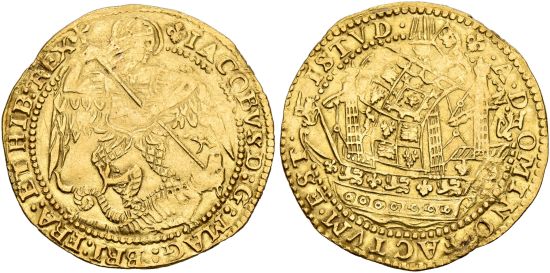This specimen was lot 1105 in Sincona sale 79 (Zürich, October 2022), where it sold for 3,800 CHF (about US$4,554 including buyer's fees). The catalog description[1] noted, "GREAT BRITAIN | Königreich, James I. 1603-1625. Angel n. d. (1623-1624), Tower Mint. Third coinage. Mintmark lis. Very rare. NGC AU Details. Mount mark (?)." The gold angel, when originally introduced in the reign of Edward IV, was worth six shillings eight pence. By the reign of James I, it had been raised to eleven shillings. With the accession of James I we drop "England" as the country name and adopt the current "Great Britain."