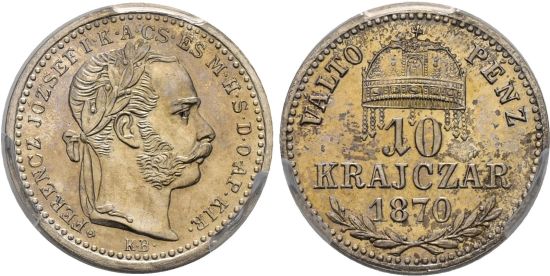 "RDR / ÖSTERREICH Franz Joseph I. 1848-1916. 10 Kreuzer 1870 KB, Kremnitz. Nachprägung mit vierblättriger Rosette am Beginn der Vorderseitenumschrift. PCGS PR66. (Austro-Hungarian empire, Francis Joseph I, 1848-1916, ten kreuzer of 1870, Kremnitz mint. Restrike with four-leaf rosette at the beginning of the obverse legend.)"