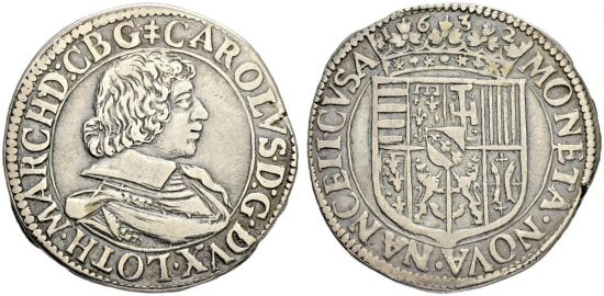 "FRANCE, Lothringen, Herzogtum, Karl IV. 1626-1634. Teston 1632, Nancy. Sehr schön. (duchy of Lorraine, Charles IV, 1626-34, teston of 1632, Nancy mint. Very fine.)"
