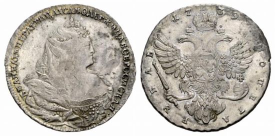 This specimen was lot 156 in Sincona sale 12 (Zürich, October 2013), where it sold for 1,500 CHF (about US$1,940 including buyer's fees). The catalog description[1] noted, "Rouble 1739, Kadashevsky Mint. Extremely fine-uncirculated with remaining mint lustre. Somewhat weakly struck." This type was issued from St. Petersburg (KM 204) and Moscow (shown here) and is rare. The coinage of Russia of the eighteenth century is a confusing and fascinating subject. Many ruble types were issued only briefly and can be dated even if they don't bear dates. This type, issued 1736-40, is priced quite a bit lower than previous issues of Peter I, Catherine I and Peter II. The massive portrait of the empress can only have been drawn from life. The rubles of Peter I were about 28 grams but shrank to 20 grams by the end of the reign of Catherine the Great.