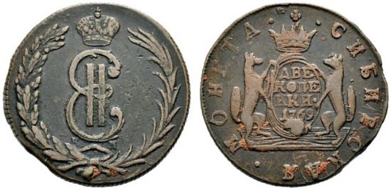 This specimen was lot 351 in Sincona sale 19 (Zürich, October 2014), where it sold for CHF 50 (about US$63 including buyer's fees). The catalog description[1] noted, "2 Kopecks 1769, Suzun Mint, KM. About very fine." This type was struck 1764-80 for circulation in Siberia and is today common.