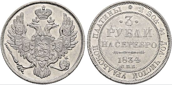 "RUSSLAND, Kaiserreich, Nicholas I. 1825-18553 Roubles Platin 1834, St. Petersburg Mint, SPB. Rare. 10 roubles according to Ilyin. Gutes sehr schön. (Good very fine.)"
