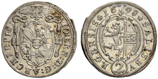 "HOLY ROMAN EMPIRE - AUSTRIA | Salzburg, Erzbistum, Johann Ernst von Thun und Hohenstein, 1687-1709. 2 Kreuzer 1698, Salzburg. Prachtexemplar. FDC. (Germany, archbishopric of Salzburg, John Ernest of Thun and Hohenstein, 1687-1709, double kreuzer of 1698, Salzburg mint. Cabinet piece, Uncirculated.)"