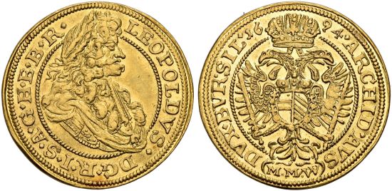"HOLY ROMAN EMPIRE - AUSTRIA. Leopold I. 1657-1705. Dukat 1694, Breslau. Mit der Signatur MMW (Martin Maximilian von Wackerl, Münzmeister in Breslau, 1692-1699). Selten. Vorzüglich-FDC. NGC UNC Details. Vorderseite leicht gereinigt. (Austria, Leopold I, 1657-1705, ducat of 1694, Breslau mint, mintmaster's initials "MMW". Rare, Extremely fine-uncirculated, Obverse slightly cleaned.)"