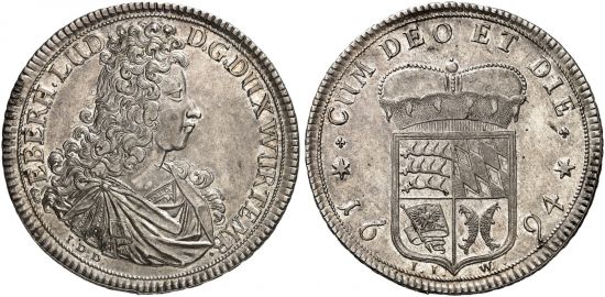 "Württemberg, Herzogtum. Eberhard Ludwig, 1693-1733. Taler 1694. Stempel von J.D. Daniel. EBERH.LUD-D.G.DUX WURTEMB• Brustbild mit Allongeperücke im römischen Harnisch und umhängenden Mantel nach rechts. Rv. *+CUM DEO ET DIE+* Das quadrierte Wappen unter Fürstenhut, darunter die geteilte Jahreszahl und die Signatur des Münzmeisters Johann Jakob Wagner. Mit Randschrift: „+DES+HOCHSTEN+HAND+SEZT+ALLE+ LAND+ IN+SICHREN +STAND“. Selten. Prachtvolle Erhaltung. Vorzüglich-FDC. Der erste Württemberger Taler mit Randschrift. (Germany, duchy of Württemberg, Eberhard Louis, 1693-1733, thaler of 1694, dies by J. D. Daniel. Obverse: cuirassed, mantled bust with long hair to right; reverse: capped and quaartered arms, date and minmaster's initials below. Rare, Magnificent condition, Extremely fine-uncirculated, the first thaler from Wurttemberg with edge lettering.)"