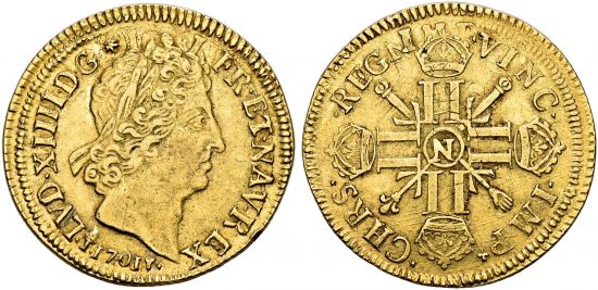 | + | * [[France 1701-N louis d'or|1701-N ''louis d'or aux 8 L et aux insignes'']] | ||