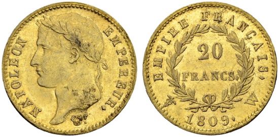 "Frankreich, I. Kaiserreich. Napoleon I. 1804-1815. 20 Francs 1809 W, Lille. Vorzüglich. (France, First Empire, Napoleon I, 1804-15, twenty francs of 1809, Lille mint. Extremely fine.)"