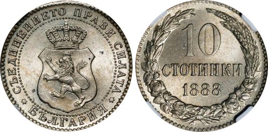 Bulgaria fought a protracted war against the Ottomans, culminating in liberation from the latter's rule in 1878. The new Bulgarian state was quite weak, however, and new conflicts drew it into the Balkan Wars of 1912-1913, along with Serbia and Greece, once again against the Ottomans in Turkey. This one-year type was struck for Bulgaria and is common. This specimen was lot 74220 in Stack's Bowers Collector's Choice sale (Costa Mesa, CA, February 2024), where it sold for $1,560. The catalog description[1] noted, "BULGARIA. 10 Stotinki, 1888. Brussels Mint. Ferdinand I. NGC MS-64. Approaching Gem status, with very few marks to be seen and gentle cartwheel luster evident throughout. A VERY SCARCE minor denomination to find in this state of preservation."