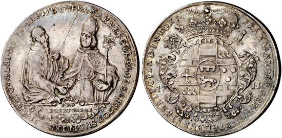 The bishops of Munster issued thalers on occasion during the early eighteenth century but a "sede vacante" issue of 1761 (Dav-2470) is the last. All of the ecclesiastical states were mediatized by Napoleon and handed over to his allies in 1800-06. This type was issued 1709-11 and is rather expensive.