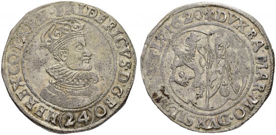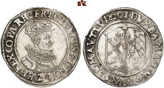 "TSCHECHIEN | Böhmen, Friedrich V. von der Pfalz (Winterkönig), 1619-1622 Kipper-24 Kreuzer 1620. Prag. Selten in dieser Erhaltung. Fast vorzüglich. Leichte Prägeschwächen. (kingdom of Bohemia, Frederick V of the Palatinate, the "Winter King", 1619-22, kipper 24 kreuzer of 1620, Prague mint. Rare in this condition, About extremely fine, Slightly weakly struck.)"