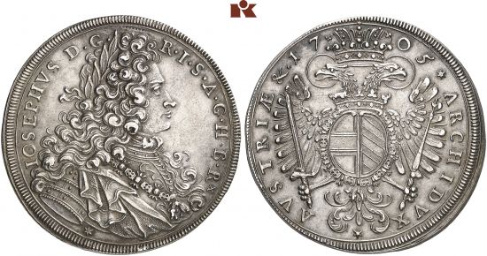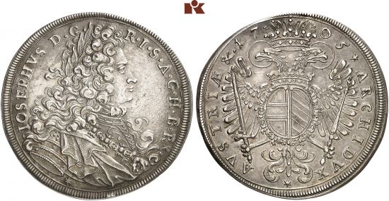 "RÖMISCH-DEUTSCHES REICH. Josef I. 1705-1711. Reichstaler 1705, München, während der Reichsbesetzung im Spanischen Erbfolgekrieg. R Sehr schön-vorzüglich. In der Schlacht bei Höchstädt 1704 wurde das bayerisch-französische Heer durch Prinz Eugen von Savoyen und den Herzog von Marlborough vollständig vernichtet. Maximilian Emanuel mußte Bayern verlassen und verlor seine Lande. Man verhängte die Reichsacht über ihn. Erst durch den Frieden von Baden 1714 wurden die Reichsacht und die damit verbundenen Sanktionen aufgehoben. Die in der Zwischenzeit in München entstandenen Münzen, wie auch das vorliegende Stück, sind von der kaiserlichen Administration in Bayern geprägt worden. (Holy Roman Empire, Joseph I, 1705-11, thaler of 1705, Munich mint under Austrian occupation during the War of the Spanish Succession. Rare, very fine to extremely fine. At the Battle of Höchstädt in 1704, the Bavarian-French army was completely destroyed by Prince Eugene of Savoy and the Duke of Marlborough. Maximilian Emanuel fled Bavaria and was placed under the Imperial ban. It was only through the Peace of Baden in 1714 that the ban and the associated sanctions were lifted. During the time of the electoral exile, Joseph I and Charles VI, through the imperial administration in Munich, struck coins of Austrian design.)"