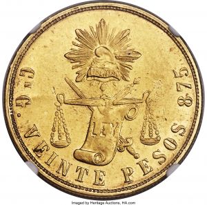 This specimen was lot 31597 in Heritage sale 3073 (Chicago, April 2019), where it sold for $2,400. The catalog description[1] noted, "Republic gold 20 Pesos 1878-Cn MS61 NGC, Culiacan mint. Slightly soft strike and a few insignificant contact marks as is often found for this issue, but still quite attractive with good luster. The first we have handled of this date." This specimen is one of a series struck at the Culiacan mint 1870-1905. Although production was substantial, many dates are rare. Mintage figures are not a reliable indicator of rarity for this type due to the accidents of hoarding; many low mintage issues are readily available while other high mintage issues are very rare. Assayer G is listed for 1876-78.