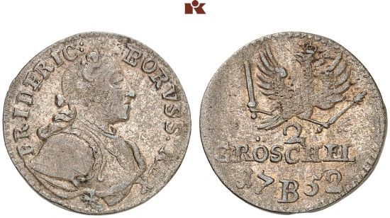 "BRANDENBURG-PREUSSEN, PREUSSEN, KÖNIGREICH, Friedrich II. der Große, 1740-1786. 2 Gröschel 1752, B, Breslau. Prägung für die Provinz Schlesien. Mit FRIDERIC - BORVSS REX in der Vorderseitenumschrift. R Sehr schön. Exemplar der Auktion Westfälische Auktionsgesellschaft 3, Dortmund 1994, Nr. 715. (Germany, kingdom of Prussia, Frederick II the Great, 1740-86, two groschel of 1752, Breslau mint, struck for the province of Silesia. Rare, very fine.)"
