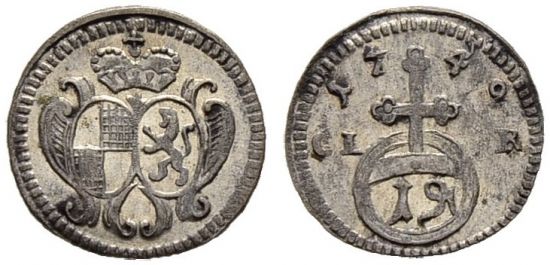The type is recorded in the SCWC for 1735-50 with a low catalog value, like many rare minors. Altho the auction catalog listed this specimen as a 1740, Ruckdeschel's term did not begin until 1742, so we have catalogued it as a 1749. The last billon pfennig was issued in 1783.