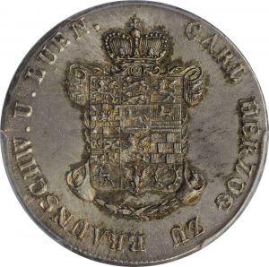 This specimen was lot 22593 in Stack's Bowers NYINC sale (New York, January 2020), where it did not sell. The catalog description[1] noted, "GERMANY. Brunswick-Wolfenbüttel. 24 Mariengroschen, 1829-CVC. Brunswick Mint. Karl II. PCGS MS-66. The catalog description[1] noted, "ZU BRAUNSCHW" variety. Quality that is SCARCELY encountered for the type, this radiating Gem offers stunning brilliance along with a pleasing steel gray tone and some shimmering iridescence. Tied with just one other example as the finest in the PCGS census." This type was struck 1824-29 simultaneously with KM 1102, which had the duke's title abbreviated "ZU BRAUNS". The denomination, equal to a gulden or two-thirds thaler, was last struck in 1834. Its silver content was 7/9 of a Prussian or Brunswick thaler (22.27 g, 0.750 fine) or 5/9 of a convention thaler (28.06 g, 0.833 fine).